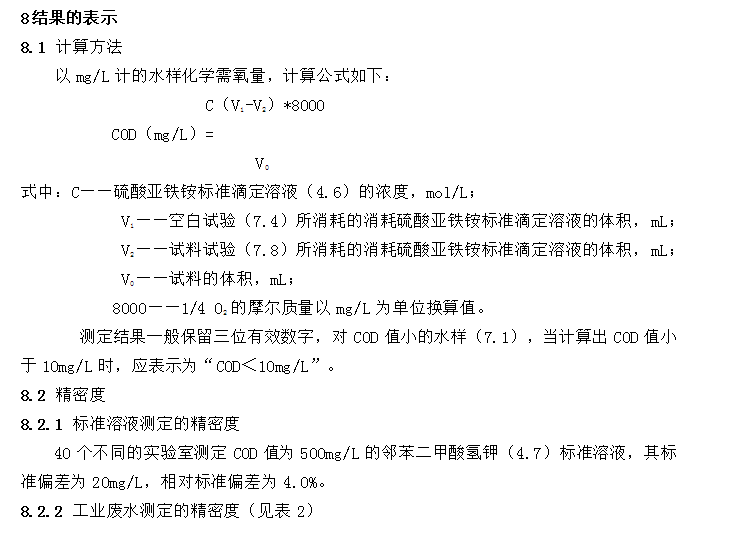 7.1 對于COD值小于50mg/L的水樣,應(yīng)采用低濃度的重鉻酸鉀標(biāo)準(zhǔn)溶液(4.5.2)氧化,加熱回流以后,采用低濃度的硫酸亞鐵銨標(biāo)準(zhǔn)溶液(4.6.4)回滴。