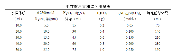 8.2 水樣用體積可在10.00~50.00ml范圍之間,但試劑用量及濃度需按下表進行相應調整,也可得到滿意的結果。