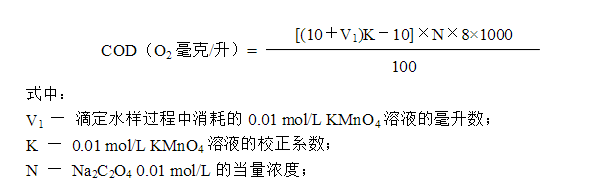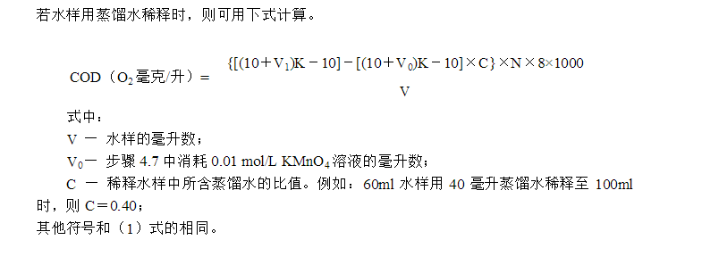 4.7 若水樣用蒸餾水稀釋時,需另取100ml蒸餾水,按步驟4.2~4.5測定空白值,記錄消耗的0.01 mol/L KMnO4溶液的毫升數V0。
