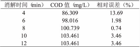 值為 100mg /L) ,在 165℃ 的消解溫度下分別消解不同時(shí)間,測(cè)定鄰苯二甲酸氫鉀標(biāo)準(zhǔn)溶液的 COD 值,結(jié)果如表 2 所示。