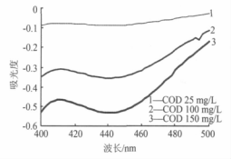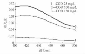 由圖 1 可知,在400~500 nm 波長(zhǎng)范圍內(nèi),對(duì)應(yīng)于水樣 COD 從 25 mg/L 變到 100 mg/L,重鉻酸鉀氧化所產(chǎn)生的 Cr(Ⅲ)的吸光度變化**大只有 0.06 多