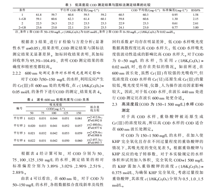 于 高濃度段 COD(150~1 500 mg/L)水樣,加入重鉻